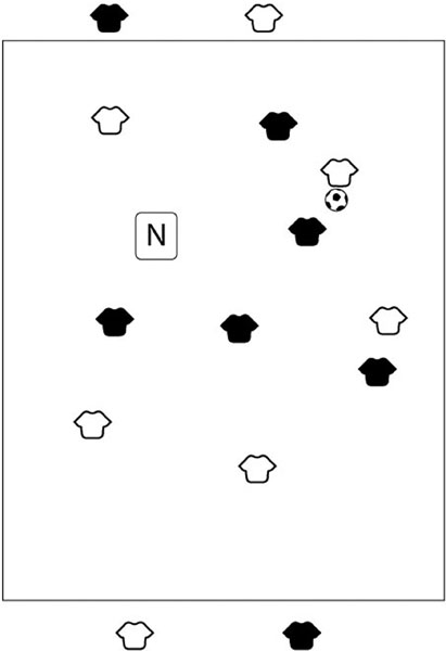 Участок поля шириной 41 на 23 метра. Каждая из команд выставляет пять игроков в поле и по одному за линией поля с двух сторон в качестве «цели». Можно также ввести нейтрального игрока. «Цели» не вступают в единоборство друг с другом. Игроки не покидают пределы поля, чтобы прикрыть «цель». «Цели» не заступают в поле, чтобы получить мяч. «Цели» начинают игру с ограничением в два касания и не могут отдавать пас напрямую друг другу. Меняйте «цели» каждые две минуты. Правило «вне игры» не работает.