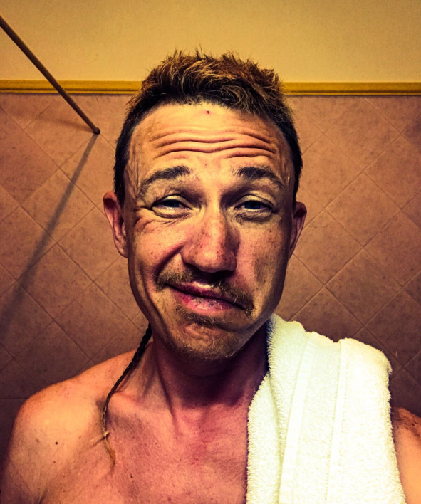 Во время остановки вижу: у автобуса, сжимая в руках бургер, сидит на корточках чумазый, сгоревший чувак, с полным ртом и взглядом голодного волка, который скорее умрёт, чем отдаст хоть кусок. И ему абсолютно всё равно, что в метре от него облегчается другой бегун.