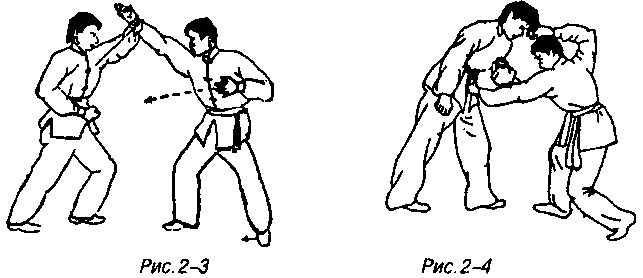Из позиции для атаки швыряемый ладонью правая нога делает шаг вперед, правая рука вспарывает вверх и одновременно с постановкой правой ноги на землю правая ладонь сверху вниз резко рубит противника по шее (рис. 2-3).