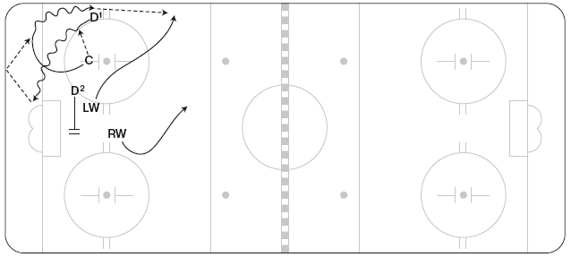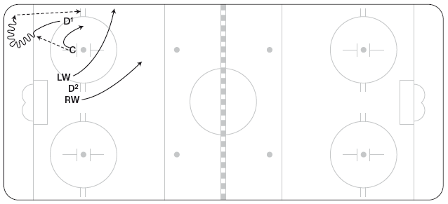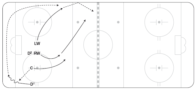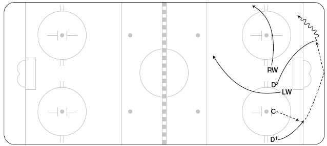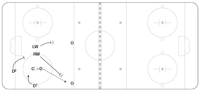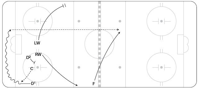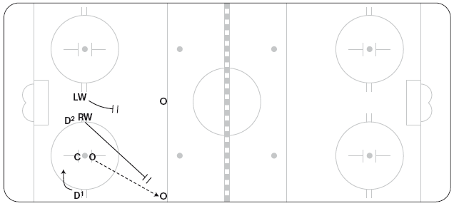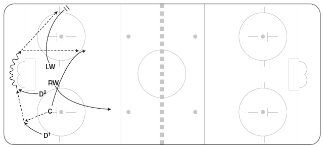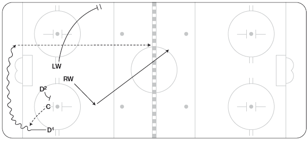 Эту схему можно использовать, чтобы застать противников врасплох или же в конце игры, когда вы отстаете или опережаете противника в счете. C выигрывает вбрасывание, отдав шайбу D1, он направляет ее вдоль лицевого борта (перед вбрасыванием защитники могут поменяться местами, чтобы упростить игру вдоль борта). RW выдвигается в угол у синей линии, а затем срезает путь поперек площадки, чтобы подстраховать LW (рисунок 11.25). LW должен добраться до угла у синей линии раньше противостоящего ему защитника. LW может вести шайбу через нейтральную зону или, если оппонент остается в зоне и подключается к атаке, отбросить шайбу от борта за спину RW.