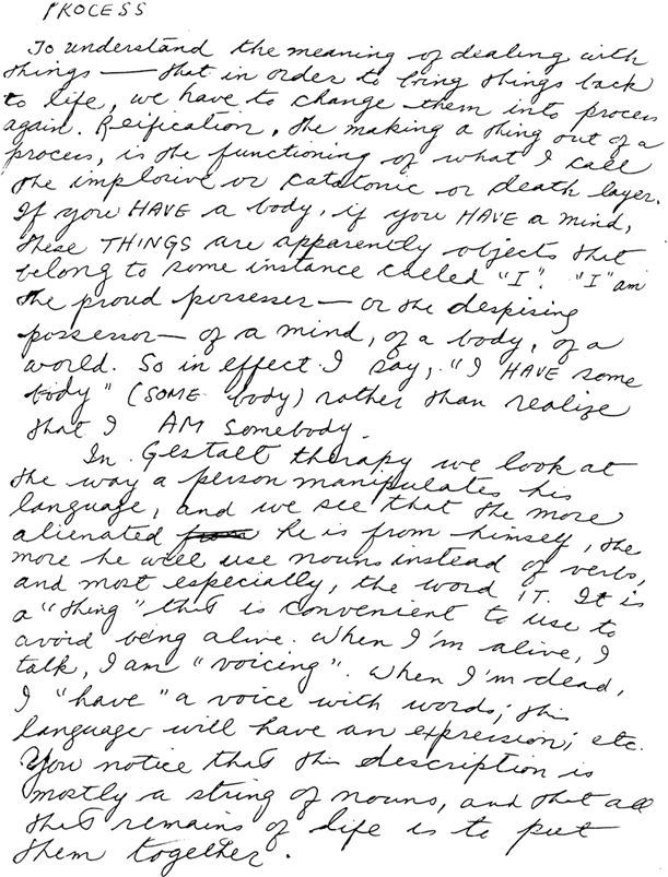 Если у нас есть тело, следовательно, мы обладаем разумом; и эти вещи явно являются объектами, принадлежащими к некоему элементу под названием «Я». «Я» — гордый — или же, напротив, отнюдь не гордый — обладатель разума, тела или мира. Таким образом, в сущности, я склонен скорее к утверждению «Я обладаю неким телом», нежели к утверждению «Я есть некто». В гештальт-терапии мы следим за тем, как человек манипулирует речью, и мы замечаем, что чем сильнее он от себя отчуждается, тем чаще из его уст звучат имена существительные, но не глаголы, а в особенности часто звучит местоимение «это».