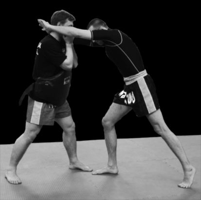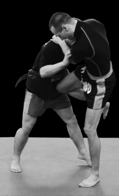 Прямой удар коленом. Наносится по траектории снизу вверх под 45 градусов в пах или в живот со смещением вперед на опорной ноге (рис. 184– 187). Обратите внимание на то, что удар коленом нужно бить сзади стоящей ногой, предварительно захватывая противника обеими руками в районе шеи и буквально насаживая его рывком рук на свое колено. Прямой удар коленом можно наносить также в голову (рис. 188, 189), техника его исполнения такая же, как и в ударе в живот, но здесь акцент идет больше на мощном движении вперед, для пробивании блока, поставленного скрещенными руками противника.