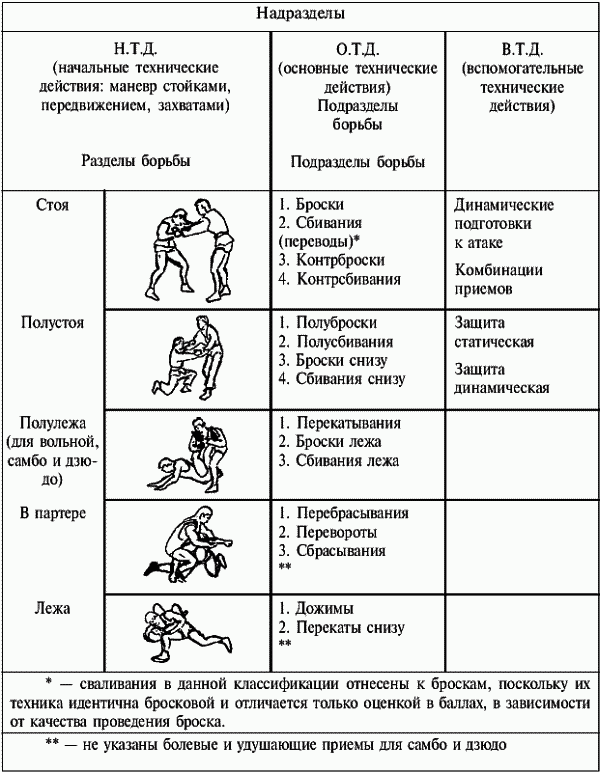 Вся техника борьбы состоит из 3-х надразделов: начальных, основных и вспомогательных технических действий.