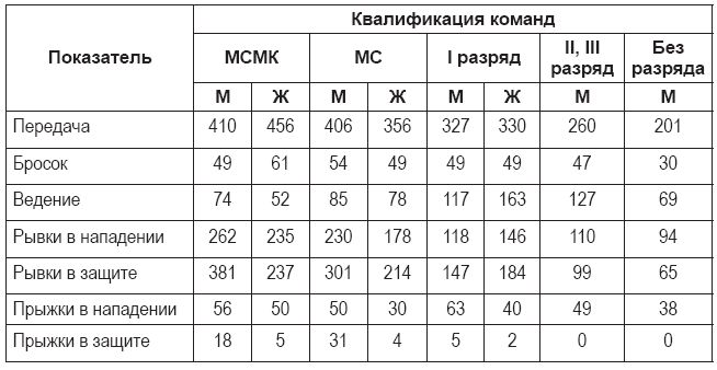 Участвуя в соревнованиях, гандболист преодолевает расстояние от 4000 до 7000 м, при переходе от защиты к нападению и обратно совершает до 50 рывков, преодолевая при этом на высокой скорости 25 % всего расстояния за игру. Количество выполняемых в игре приемов четко отражает квалификацию команды (табл. 18).