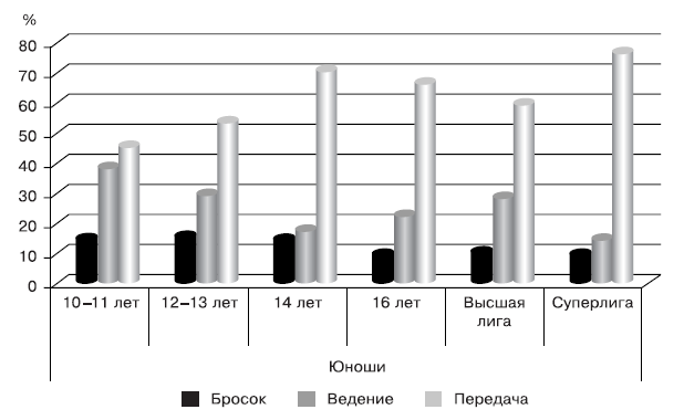 В 12–13 лет мальчики значительно ускоряют темп игры, ведений у них 29 %, а передач – 56 %, но с огромным количеством ошибок из-за желания скорее забросить мяч в ворота – 15 %.