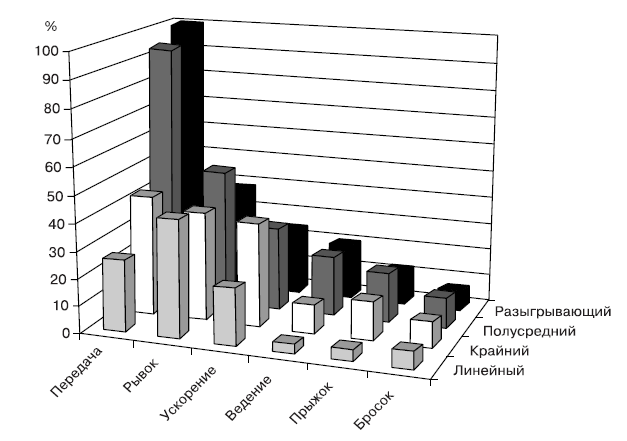 Рис. 109. Соотношение показателей двигательной деятельности в нападении гандболистов высокой квалификации различного игрового амплуа