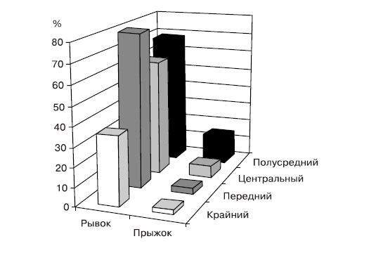 Большое расхождение наблюдается и в количестве выполнения приемов игроками различного игрового амплуа (рис. 109).