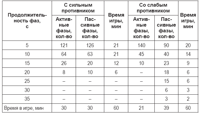 В игре чередование этих фаз довольно разнообразно. Активная фаза в 5 с может следовать за пассивной в 20 с, а после нее может снова наступить активная фаза в 10 или 20 с. В тренировочном процессе для создания специфической для соревновательной деятельности гандболистов нагрузки строить упражнения необходимо с учетом приведенных интервалов чередования работы и отдыха.
