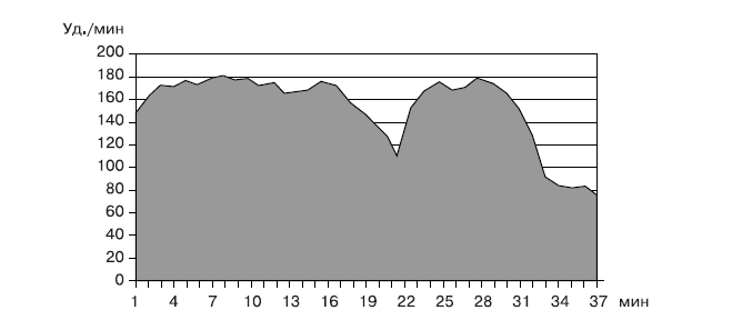 ЧСС у полевых игроков высокой квалификации изменяется на 1–3 удара каждые 10 с, отражая переменную деятельность гандболиста на игровом поле. С первых же минут встречи гандболист ведет игру с высокой интенсивностью на пульсе 160–180 уд./мин. На размах колебаний ЧСС влияет значимость соревнований, квалификация противника, счет игры. У полевых игроков пульс в календарных играх с равным противником не опускается ниже 162 уд./мин и при этом более 50 % всего времени держится в пределах 180 уд./мин (рис. 111).