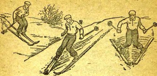 При спуске с горы наискось можно применить торможение полуплугом. Передай для этой цели вес тела на ногу, стоящую выше по склону, и отведи задний конец ниже скользящей лыжи в сторону. Затем плавно нажми на поставленную под углом лыжу, и она начнет сгребать снег своим внутренним ребром. Чем дальше в сторону отведешь задний конец тормозящей лыжи и чем сильнее нажмешь на нее ногой, тем скорее замедлится быстрота спуска.