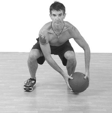 2. Опуститесь в присед так, чтобы голени и бедра образовали угол 90 градусов, и коснитесь мячом левой стопы.