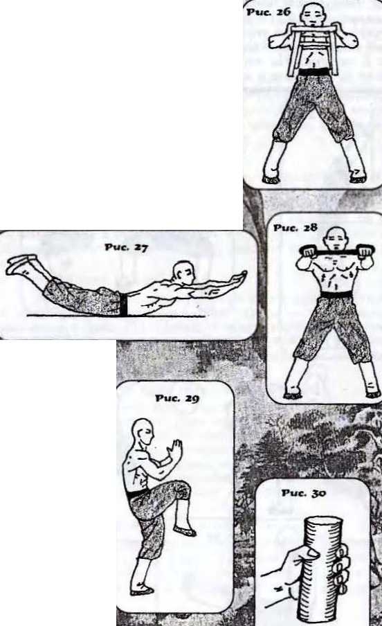 Возьмите табурет, поднимите его на уровень плеч и сжимайте двумя руками со всей силой (рис. 26). Сохраняйте усилие в течение 5 выдохов. Отдохните 1—2 минуты и повторите упражнение. На вдохе сосредоточьте ци в даньтянь, на выдохе направляйте в руки. Выполнив упражнение, разотрите грудь ладонью. Вместо табурета можно сжимать ствол дерева, столб и т. п.