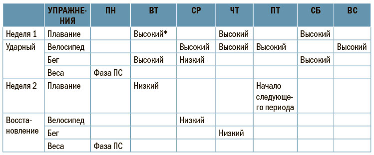 В ударный период основную часть занятий большого объема и высокой интенсивности нужно сосредоточить в бассейне и седле. Беговые тренировки с увеличенной нагрузкой требуют особой осторожности, поскольку из-за выхода за пределы своего уровня именно в этом виде спорта чаще всего случаются травмы.