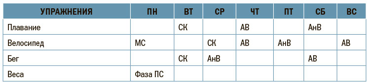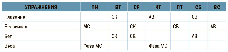 В этих таблицах тренировкам, приведенным по дням и видам спорта, соответствуют аббревиатуры базовых и особых качеств, описанные в главе 6, а также в приложении Б, приложении В, приложении Г и приложении Д: