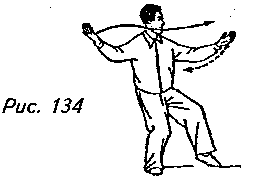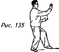 и поверните обе ладони от себя, слегка сгибая локти. Одновременно с этим поверните корпус немного направо, перенесите вес своего тела назад на правую ногу и приподнимите левую пятку, делая левую ногу “опустошенной”. Взгляд при этом должен быть направлен на левую ладонь (рис. 134).