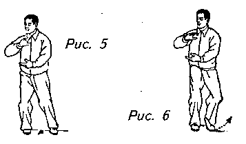 Движение 1(продолжение рис. 4): Немного поверните корпус вправо, перенося вес тела на правую ногу, и слегка придвиньте левую пятку к правой, опираясь пальцами на пол. В то же время, поднимите правую руку, приложив ее к середине груди, ладонью вниз, пальцы чуть расставлены и полусогнуты; левую же руку переместите вниз и вправо, чтобы она расположилась непосредственно под правой рукой, ладонью вверх; держите пальцы чуть расставленными и полусогнутыми. Теперь это должно выглядеть так, словно ваши руки держат большой мяч. Взгляд направлен на правую руку (рис. 5, 6).
