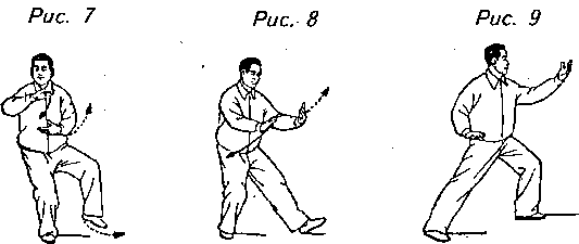 Движение 2: Поверните верхнюю часть корпуса влево, одновременно перемещая пальцы правой ноги чуть вперед, затем сделайте шаг влево левой ногой и перенесите вес тела на нее, выполняя левый “шаг вдоль кромки радуги” (в боевом искусстве его обычно называют “выпад вперед”). Во время переноса центра тяжести ваши руки выполняют противоположные движения: левая рука перемещается влево-вверх до уровня глаз, ладонь обращена вверх, а правая рука опускается до правого бедра с ладонью вниз. Взгляд теперь направляется на левую ладонь (рис. 7, 8, 9).