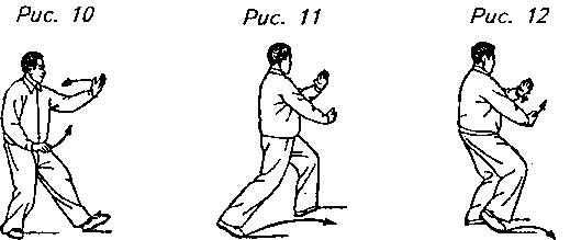 Движение 3: Перенесите вес своего тела опять на правую ногу, слегка выверните от себя пальцы левой ноги и одновременно с этим поверните корпус влево, вновь перенося вес тела на левую ногу. В это же время переместите левую руку вниз к середине груди ладонью вниз, а правую руку отодвиньте по кривой влево, чтобы она оказалась как раз под левой рукой. Правая ладонь направлена вверх, будто поддерживая большой мяч между руками. Правая нога в этот момент перемещается влево с опущенными вниз пальцами. Взгляд направлен на левую ладонь (рис. 10, 11, 12).