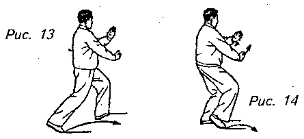 Движение 4: Теперь сделайте правой ногой шаг вправо и перенесите вес тела на нее, образуя правый “шаг вдоль кромки радуги”. Одновременно с этим поднимите вашу правую руку до уровня глаз с направленной вверх ладонью, а левую руку опустите до левого бедра с ладонью вниз. Взгляд направлен на правую ладонь (рис. 13, 14).