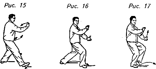 Движение 5: Перенесите вес своего тела опять на левую ногу, слегка выверните от себя пальцы правой ноги и одновременно с этим поверните корпус вправо, вновь перенося вес тела на правую ногу. В это же время переместите правую руку вниз к середине груди ладонью вниз, а левую руку отодвиньте по окружности вправо так, чтобы она оказалась как раз под правой рукой. Левая ладонь направлена вверх, будто поддерживая большой мяч между руками. Левая нога в этот момент перемещается вправо с опущенными вниз пальцами. Взгляд направлен на правую ладонь (рис. 15, 16, 17).