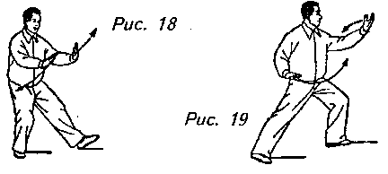 Движение 6: Теперь сделайте левой ногой шаг влево и перенесите вес тела на нее, образуя левый “шаг вдоль кромки радуги”. Одновременно с этим поднимите вашу левую руку до уровня глаз с направленной вверх ладонью, а правую руку опустите до правого бедра ладонью вниз. Взгляд направлен на левую ладонь (рис. 18, 19).