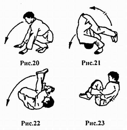 2. Упираясь ладонями об пол, оттолкнитесь ногами и выполните кувырок вперед. Подбородок должен быть прижат к груди (рис. 21–23)
