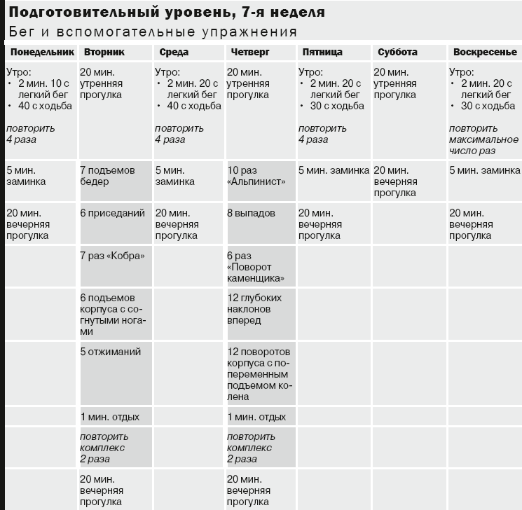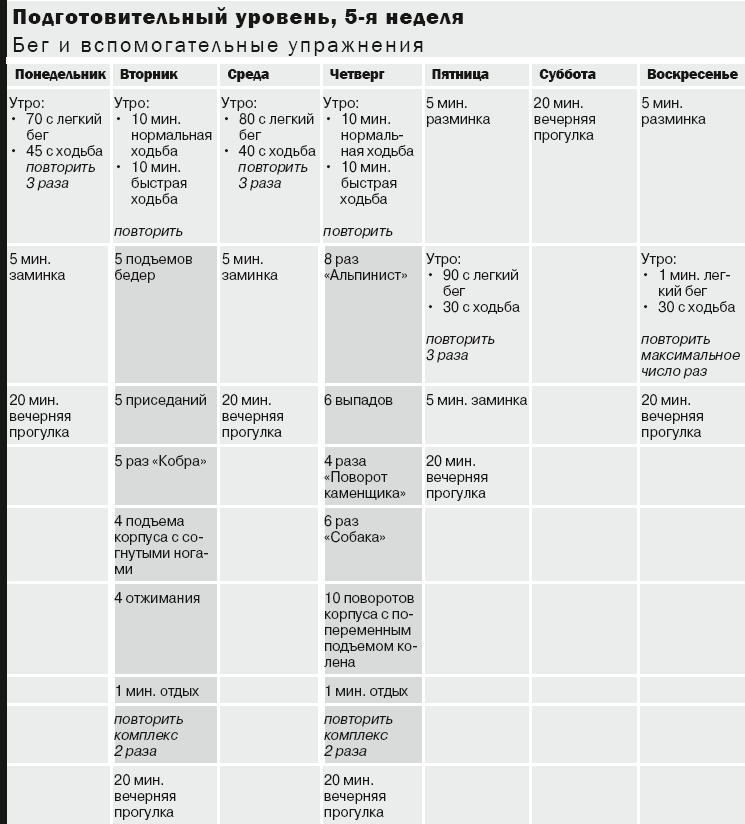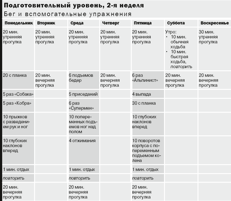 12:00. Перерыв на обед? Еще нет! В качестве полуденной тренировки разомнитесь ходьбой в течение 5 минут, затем выполните вспомогательные упражнения из расписания на этот день. Позже по ходу программы вы сможете побегать в парке.