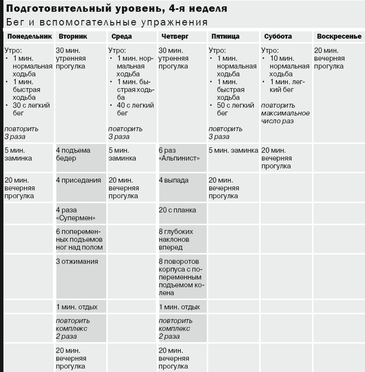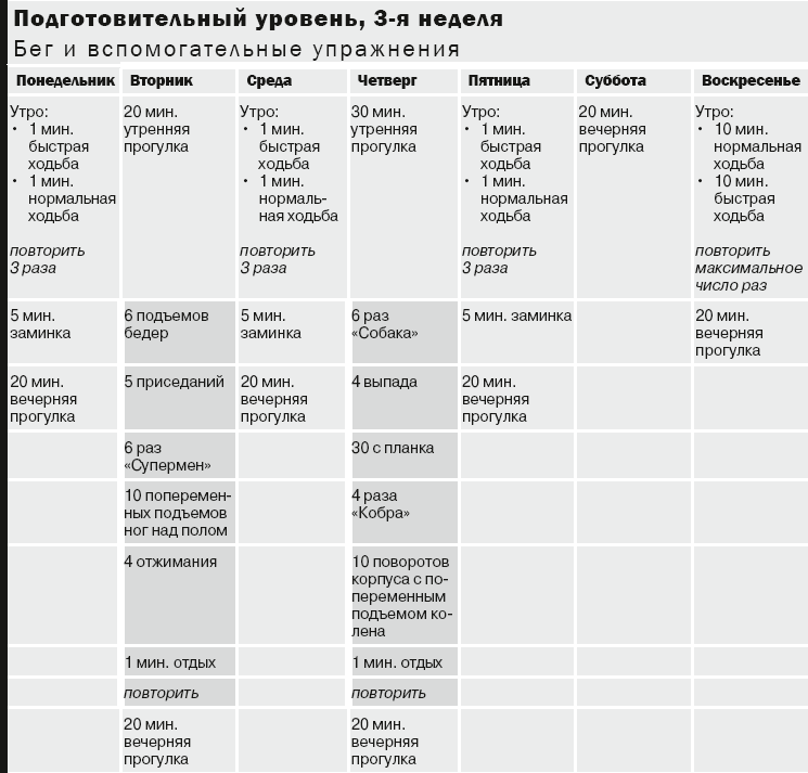 Примечание. Расписание приема пищи и тренировок имеет целью максимизацию снижения веса до начала занятий по программе подготовительного уровня или во время нее; оно не должно использоваться совместно с программами уровней 1 и 2, которые отличаются интенсивностью и требуют более сбалансированного подхода к питанию, особенно к углеводам до тренировки. Программа питания, приведенная ниже, требует, чтобы вы бегали утром натощак в целях максимизации сжигания жира. Эта методика несовместима с тренировками высокой интенсивности.