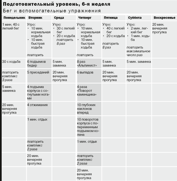 Примечание. Разомнитесь 5 минут перед интервальной тренировкой или вспомогательными упражнениями: растягивайтесь после каждой тренировки (интервалы кардиоупражнений, вспомогательные упражнения). На с. 169–174 вы найдете описания упражнений для разминки и растяжки. Используйте шкалу на с. 97 для определения уровней нагрузки (легкой, умеренной и высокой).