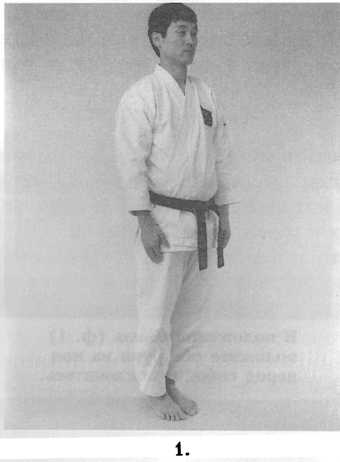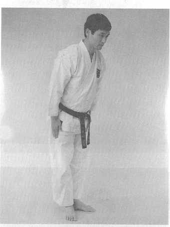 Стойте вертикально в МУСУБИ-ДАЧИ или ХЕЙСОКУ-ДАЧИ; руки сбоку на бедрах. Затем поклонитесь держа голову и спину прямо. Оставайтесь бдительным все время.
