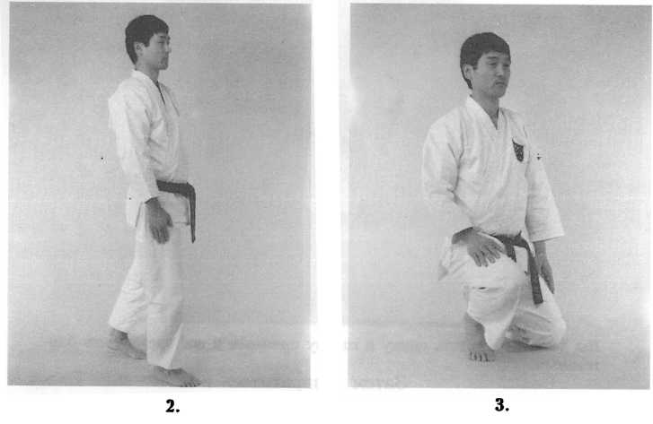 СЭЙЗА — это японское официальное положение сидя. Из МУСУБИ-ДАЧИ или ХЕЙСОКУ-ДАЧИ (ф. 1) сделайте шаг назад левой ногой (ф. 2), затем опуститесь на колено (ф. 3).