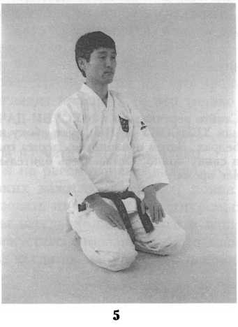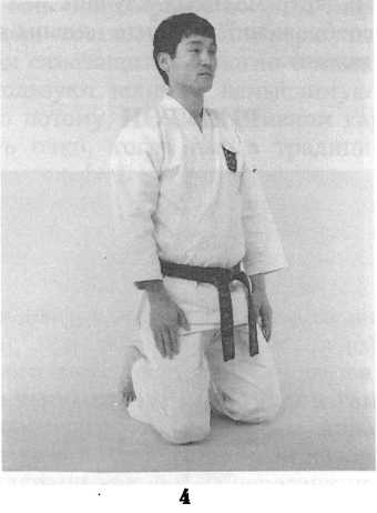 Сдвиньте правую ногу назад таким же образом (ф. 4), затем выровняйте пальцы ног и опуститесь в положение СЭЙЗА (ф. 5). Расстояние между коленями должно равняться ширине двух кулаков. Спину и голову поддерживайте в вертикальном положении. Для того, чтобы встать, проделайте все это в обратном порядке.