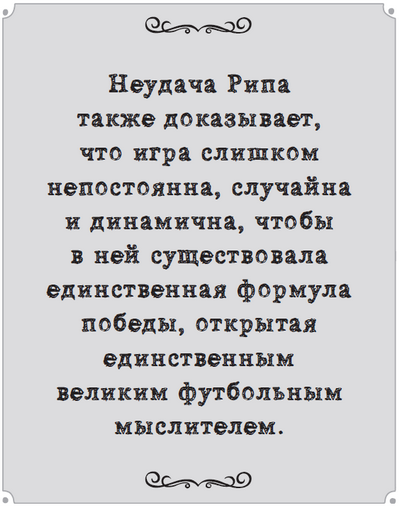 Неудача Рипа также доказывает, что игра слишком непостоянна, случайна и динамична, чтобы в ней существовала единственная формула победы, открытая единственным великим футбольным мыслителем. Более того, игру будут двигать вперед многочисленные маленькие открытия многих людей.