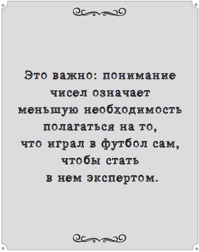 Это важно: понимание чисел означает меньшую необходимость полагаться на то, что играл в футбол сам, чтобы стать в нем экспертом. Сила чисел заключается в той информации, которую они могут дать, но они также являются мощным оружием в политическом поединке футбола. Информация – сила. Она может давать влияние и отнимать его. Числа и информация подразумевают открытость и возможность оценивать по достоинству, таким образом помогая покончить с традицией. Хорошей новостью для фанатов является то, что сила произвольности и случайности в футболе гарантирует, что игра не изменится фундаментально: будет достаточно возможностей для побед неудачников над фаворитами, для увлекательной драмы, для того чтобы мяч ударялся в перекладину, взмывал в небо и в итоге вкатывался в ворота.