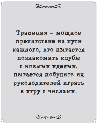 Пугающая перспектива, что с огромным количеством данных ничего не сделаешь, является очень привлекательным вариантом для многих главных тренеров и владельцев. Они даже не знают, откуда начинать. Более того, многие владельцы начинают вести себя иррационально в тот момент, когда они оказываются рядом с полем. Как сказал нам Кит Харрис из Seymour Pierce, когда дело доходит до того, что надо принять решение на основании доказательств, а не интуиции, «слишком многие владельцы начинают срывать с себя деловые костюмы и надевать тренировочные». Наконец, в отличие от американских бейсбольных команд (в лиге с гарантированным членством и стабильными доходами) футбольные клубы сталкиваются с более очевидной капиталистической системой: переход в низшую лигу и тень банкротства и внешнего управления. Этот риск падения делает большинство принимающих решения более консервативными и не желающими пробовать новые идеи. Когда на кону работа, сторонникам традиционного подхода проще «окапываться».