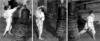 На фотографии можно видеть отработку ударной техники на «балде». Кстати, это великолепное исполнение классических ударов «плевок», «накрут» и «раскол».