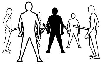 Атакующие бойцы располагаются кругом. В центр круга становится «слепой» — боец, защищающийся с закрытыми глазами. От него до атакующих должна быть дистанция атаки 2–2,5 метра.