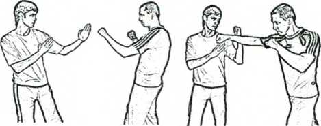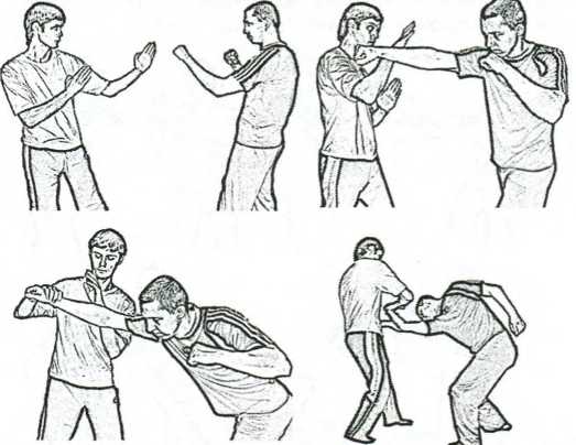 В вин чунь такой уход часто сопровождается блоком или захватом, которые усиливают инерцию противника и еще более способствуют потери равновесия. Ниже (рис. 1.9) приводится один из возможных примеров, как можно вывести противника из равновесия. Противник наносит акцентированный удар правой рукой без соблюдения принципа равновесия. Боец делает шаг в сторону левой ногой. Одновременно выполняет мягкий перенаправляющий блок предплечьем левой руки. Блок делается по ходу вектора удара противника и усиливает его инерцию. Противник проваливается. Боец наносит удар свободной правой рукой.