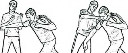 Во многих стилях практикуют вложение массы тела в удар. В других единоборствах пытаются использовать потерю центрированности бойца в защитно-контратакующих действиях. Если противник при ударах не соблюдает принцип центрированности и центр тяжести тела выходит из равновесия, то создается благоприятная возможность с помощью блоков, захватов вывести противника из равновесия путем броска. Ярким примером являются так называемые мягкие стили, которые в основу тактики боя положили принцип использования силы противника. В эту группу можно отнести айкидо, тайцзицюань, илицюань, вьетнамский вин чунь. На рис. 1.8 продемонстрирована одна из возможных бросковых техник при подобных ситуациях. Противник наносит акцентированный удар без соблюдения равновесия. Боец своевременно ставит мягкий блок[2] правой рукой и проваливает противника. Одновременно делая захват его ударной руки. Левая рука дополнительно контролирует руку противника. Как только инерционное движение противника закончилось, боец делает бросок, путем скручивания ударной руки противника влево - одновременно воздействуя на локоть противника своей левой рукой, а на предплечье своей правой рукой.