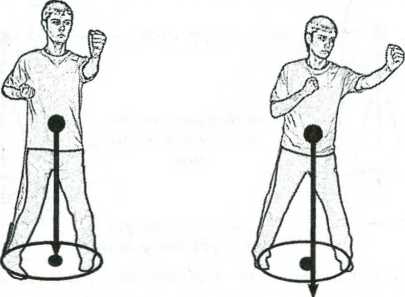 Вложение массы тела в удар является физически обоснованным, так как сила удара зависит от скорости и массы. Поэтому вложение массы тела в удар усиливает его. Вместе с вложением массы тела происходит и движение центра тела. Поэтому при ударе боец должен сохранить меру между силой удара и равновесием. Ударить так, чтобы одновременно и вложить массу тела в удар и удержать проекцию центра тела в зоне устойчивости (рис. 1.7).