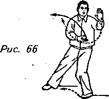 Движение 1 (продолжает рис. 65): Отведите верхнюю часть туловища назад, перенесите вес тела на левую ногу, поверните правый носок вовнутрь и верхнюю часть корпуса налево. Во время выполнения этого поворота перемещайте обе руки (левая выше правой) перед грудью влево до тех пор, пока левая рука не займет горизонтального положения слева от левого бока с поверхностью ладони, обращенной под углом вниз, а правая рука в это же время не окажется перед левым запястьем с ладонью, направленной вперед. Взгляд — на левую ладонь (рис. 66).