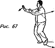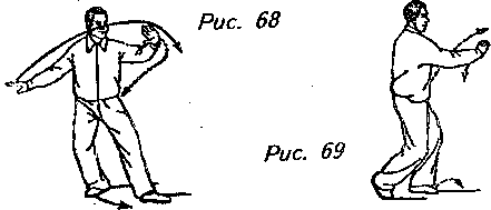 Движение 2: Переместите центр тяжести тела на правую ногу, а левую ступню пододвиньте поближе к правой. Одновременно с этим поднимите правую руку по кривой к верхней правой точке корпуса, пока она не достигнет уровня плеча; ладонь должна быть обращена от тела. Левую руку проведите обратно по кривой перед животом так, чтобы она оказалась перед правым плечом с ладонью, обращенной к телу. Взгляд должен быть направлен на правую руку (рис. 67).