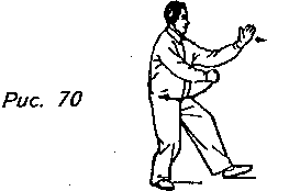Движение 4: Поднимите левую руку от левого бока, проводите ее над запястьем правой руки вперед пока она не окажется на уровне носа с ладонью, обращенной вправо. Сожмите правую ладонь в кулак и установите его под локтем левой руки таким образом, чтобы ямка, образованная большим и указательным пальцами, была направлена вверх. Одновременно с этим перенесите вес своего тела на правую ногу и сделайте левой ногой маленький шажок вперед, не отрывая пятки от земли, немного согнув колено и переходя на левый "свободный шаг”. Взгляд должен быть направлен в сторону левой ладони (рис. 70).