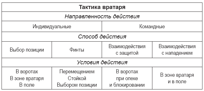 Тактическое мастерство вратаря, как и любого игрока команды, определяется прежде всего умением принять наилучшее решение. Однако он не может заранее четко планировать свои действия, так как они зависят от действий полевых игроков, направления полета мяча к воротам. Верное решение ответных действий относится к тактическому мастерству стража ворот. Общая схема тактики вратаря представлена в табл. 9.