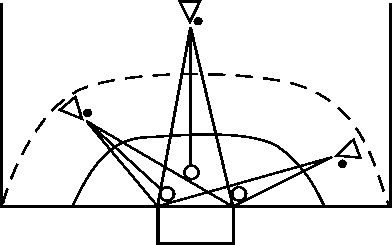 При выборе позиции в воротах вратарь перемещается от штанги до штанги по прямой и по воображаемой дуге, соединяющей обе штанги ворот (рис. 76).