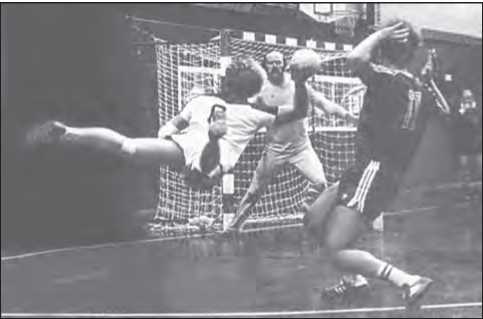 Выбор позиции в площади вратаря не менее важен. Очень трудными для задержания являются мячи, посланные от линии центральной зоны, так как у нападающего здесь большие возможности для выбора направления броска. В таком случае вратарь выбирает позицию, значительно удаленную от ворот. Он смело должен выйти вперед, чтобы уменьшить угол броска (рис. 78). Таким выходом вперед вратарь уменьшает пространство, которое ему надо загораживать, чтобы мяч не попал в ворота.