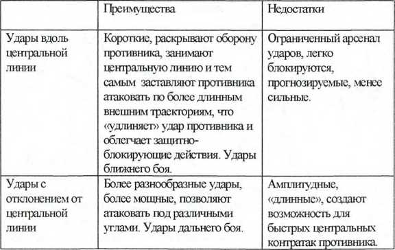 Таблица 2.1. Особенности ударов относительно центральной линии