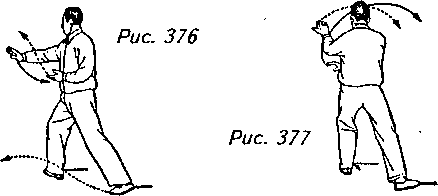 Движение 1 (продолжает рис. 375): Поверните корпус на 180° вправо. Поворачиваясь, шагните вперед левой ногой и перенесите на нее вес своего тела, переходя на левый “шаг вдоль кромки радуги”. Одновременно с этим поверните левую ладонь вверх и отведите ее вперед над правым запястьем, которое в это время нужно переместить назад и оставить ниже левого локтя ладонью вниз. Взгляд должен быть направлен на левую ладонь (рис. 376, 377).