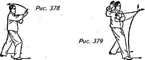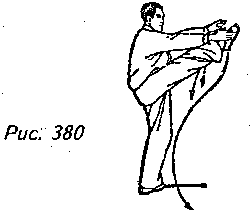 Движение 2: Перенесите центр тяжести своего тела на правую ногу, поверните левый носок вовнутрь и продолжайте поворачивать корпус вправо, удерживая вес тела на левой ноге. Поднимите правую ступню и стремительно проведите ее вверх и вправо, почти выпрямив колено и направляя носок вперед. Одновременно с этим пронесите обе руки поперек лица, а потом вперед, пытаясь дотянуться до правой ступни, левая ладонь должна при этом опережать правую. Взгляд обращен к правой ладони (рис. 378, 379, 380).