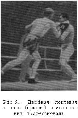 Возможна также левая двойная локтевая защита, но она более пассивна. Можно также применить ряд комбинированных защит, и в частности защиту отскоком назад с одновременным подниманием левого плеча.